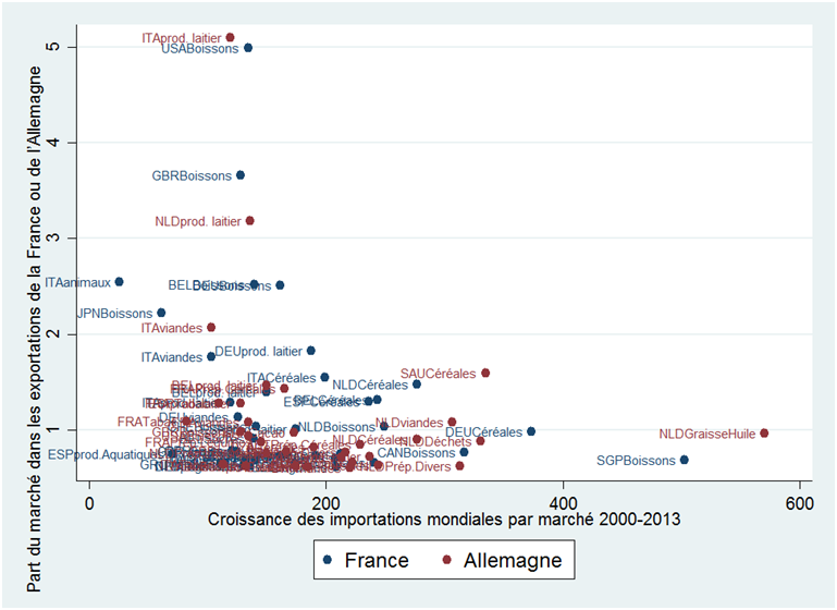 La demande adressée à la France a globalement crû moins vite que celle adressée à l’Allemagne dans le secteur agroalimentaire, ce qui s’explique à la fois par la spécialisation géographique et sectorielle de ces deux pays. Ces spécialisations n’expliquent par toute la différence de performance à l’export des deux pays. Sur les mêmes marchés, les exportations de France et l’Allemagne ont connu des évolutions différentes.