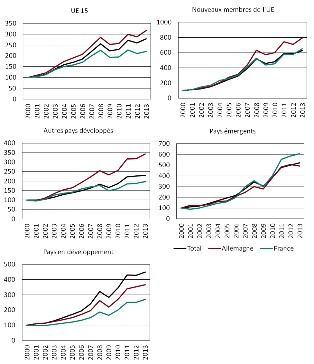 | Graphique 4 : Comparaison des performances française, allemande et mondiale par région, 2000-2013, indice 2000=100 |