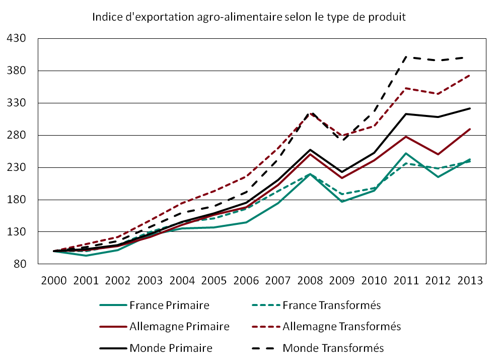 En termes de produits, La demande mondiale de produits transformés a augmenté plus vite que celle des produits bruts d’après le graphique 5 (courbes vertes). Les exportations de l’Allemagne ont connu une évolution similaire tandis qu’en France les exportations de produits transformés et bruts ont crû à la même vitesse. La France ne semble pas avoir tiré parti de la hausse de la demande pour les produits agroalimentaires, relativement à l’Allemagne.