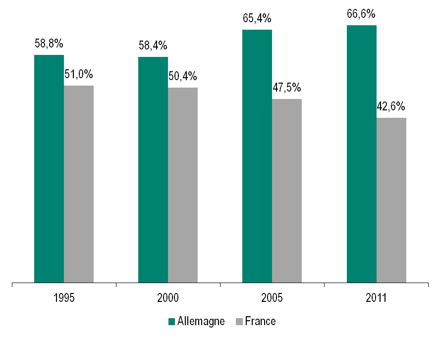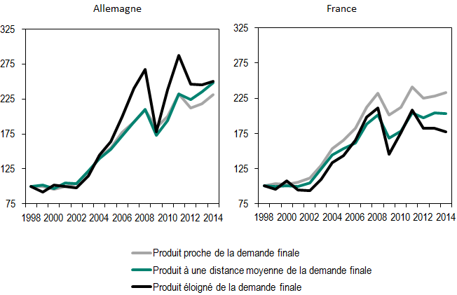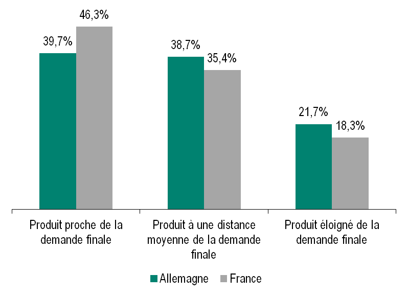 Comparée à la France, l’Allemagne importe depuis le début des années 2000 relativement plus de produits situés au début de la chaîne de production. Cela lui permet de continuer à incorporer ses propres facteurs de production dans les produits achetés en Allemagne.