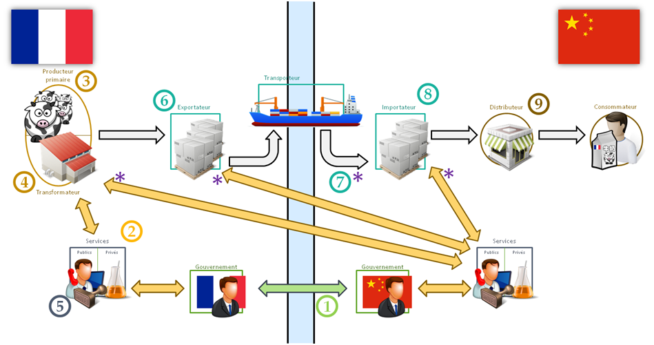 L’exportateur (6) doit être enregistré auprès des douanes chinoises et est essentiellement concerné par les exigences en termes de conditionnement et d’étiquetage. Toutes les informations légales devant être écrites en chinois et étant souvent différentes des européennes (en termes de valeurs nutritives, etc.), l’étiquetage peut s’avérer assez contraignant et coûteux. Le transporteur (7) peut dans certains cas être également soumis à certaines normes, notamment sur le stockage.