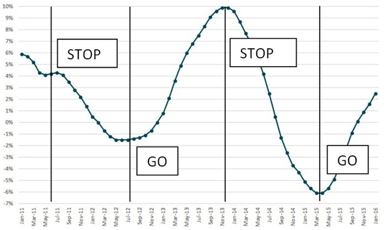En France, le gouvernement mène également une politique de stop and go, d’abord en voulant ralentir la hausse des prix à partir de 2012, puis en cherchant à partir de 2014 à relancer le marché immobilier et la dynamique de prix pour stimuler la croissance. De 2012 à 2014, il a affiché la volonté de faire baisser les prix de l’immobilier dont la cherté serait un handicap pour l’économie française [1]. Cette stratégie s’est notamment traduite par la loi ALUR du 24 mars 2014 dont l’un des dispositifs vise un encadrement des loyers, et donc in fine une baisse des prix immobiliers. Cette politique paraît avoir accompagné le retournement du cycle immobilier en influençant le retournement des anticipations des agents. Selon l’Insee, le marasme dans la construction a été le principal frein à la croissance en France entre 2012 et 2014, l’investissement des ménages étant ressorti comme la principale contribution négative à la croissance. Selon le Ministre des finances Michel Sapin, « la construction est le problème de l’économie française » (février 2015). A l’été 2014, l’assouplissement de la loi ALUR annonçait un revirement, confirmé à l’automne 2015 avec l’annonce par le Président de la République de mesures pour faciliter l’accès à la propriété, via un élargissement du prêt à taux zéro. L’objectif est de créer une dynamique pour enrayer la baisse lente des prix de l'immobilier qui s'était engagée depuis 2012, et qui coïncidait avec une diminution de l'activité dans le secteur du bâtiment.