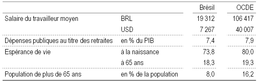 Le système des retraites est l’un des plus épineux problèmes du budget public au Brésil. Selon l’OCDE (2016a), la part des dépenses publiques consacrées aux pensions de retraite au Brésil (7,4 % du PIB en 2014) est très proche de celle de la moyenne de l’OCDE (7,9 %), alors que la part de la population brésilienne âgée de plus de 65 ans y est deux fois moindre que dans l’OCDE (8 % contre 16%, tableau 1). Au moins deux mesures s’imposent pour éviter que le système devienne insoutenable :