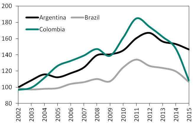 The first challenge the region is being confronted to is, not surprisingly, the drop in commodity prices. The sustained growth experienced by the region during the first decade of the 21st century was accompanied by a constant improvement of terms of trade (Figure 1). The beginning of the current decade coincided however with the start of a sharp decline in the price of most commodities produced and exported by the region. As shown by the graph below, Brazil and Colombia's terms of trade were in 2015 back to their 2004 levels. That is almost a 45% drop for Colombia and nearly 25% for Brazil.