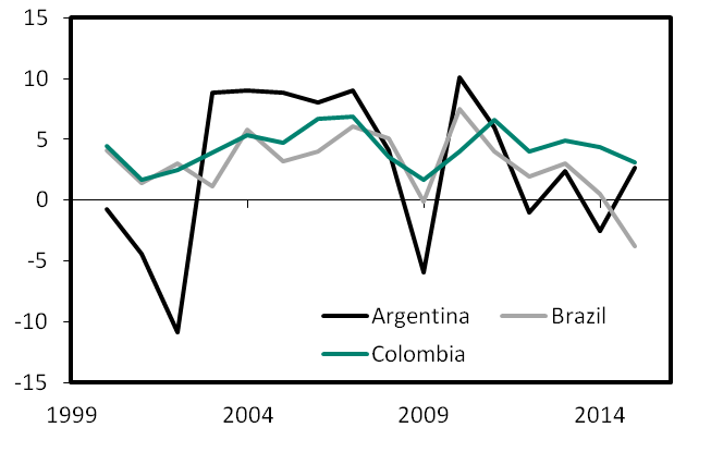 The steady decline in the region's terms of trade dragged economic growth. Argentina experienced a recession in 2014 followed by Brazil in 2015 (Figure 2). Colombia's growth is expected to drop from 6.6% in 2011 to 2.5% in 2017. In the short term the region needs therefore to address the drop in commodity prices. Sustaining the previously obtained gains in terms of the reduction in poverty rates and the rise of a wider middle class will depend on how this short term challenge is managed. The region has however long faced the fluctuation of raw materials and commodity prices. The improved terms of trade of the beginning of the century hid in fact, for a while, another common and long term challenge: the low productivity of Latin American economies.