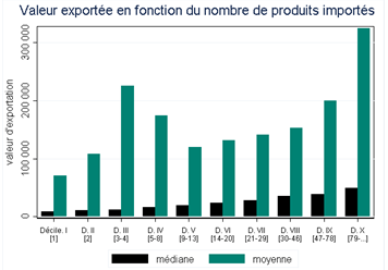 Les activités d’importations et d’exportations paraissent solidement corrélées. On observe d’abord que les entreprises qui importent une plus grande variété de produits sont également celles qui exportent le plus en valeur (graphique 1.a). Par exemple, les firmes qui importent un seul produit (1er décile) exportent en moyenne pour une valeur inférieure à 80 000 euros alors que les firmes qui importent entre 30 et 46 produits (8ème décile)  exportent pour environ 150 000 euros par an.