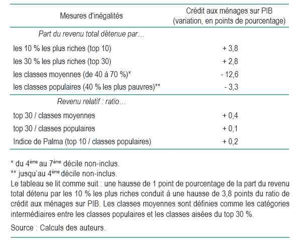 L’élévation du crédit distribué aux ménages est systématique, mais les effets sont plus importants lorsque les classes moyennes sont concernées. Alors qu’une baisse de 1 point de la part du revenu détenu par les classes populaires aboutit à une hausse de 3,3 points du ratio crédit aux ménages sur PIB, la même baisse de 1 point de la part des classes moyennes aboutit à une hausse du ratio près de 4 fois supérieure.