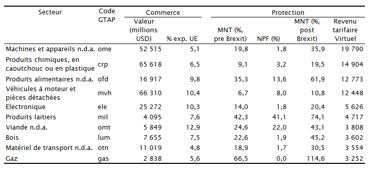 Le secteur le plus exporté est celui de l’automobile (véhicules et pièces), pour une valeur de plus de 66 milliards de dollars, le Royaume-Uni étant la destination de 10,4 % des exportations européennes de ce secteur en valeur. Il est suivi par le secteur de la chimie, avec 65,6 milliards. Néanmoins, le secteur qui apparaît comme le plus menacé est celui des machineries électriques et autres équipements (médicaux, optiques…) : la valeur des exportations est moins importante, environ 53 milliards de dollars, mais la remontée des barrières au commerce, en particulier les mesures non tarifaires, risque d’être particulièrement forte en cas de hard Brexit. Ces dernières pourraient être presque doublées et leur équivalent tarifaire passer de 20 % à 36 % environ. Pour ces mêmes raisons, plusieurs secteurs agricoles figurent parmi ceux qui risquent d’être le plus fortement impactés. Leurs flux d’exportation sont réduits par rapport à ceux des secteurs industriels cités auparavant, presque 4 fois plus faibles si on considère le secteur des « autres produits alimentaires » et même 16 fois plus faibles dans le cas du secteur des produits laitiers. Toutefois, la remontée des barrières au commerce pourrait être extrêmement importante : le droit de douane passerait de 0 à 13.6 % pour les « autres produits alimentaires » et à 41 % pour les produits laitiers. À cela s’ajouteraient des mesures non tarifaires dont le caractère restrictif pourrait atteindre 62 % et 74 %, respectivement.