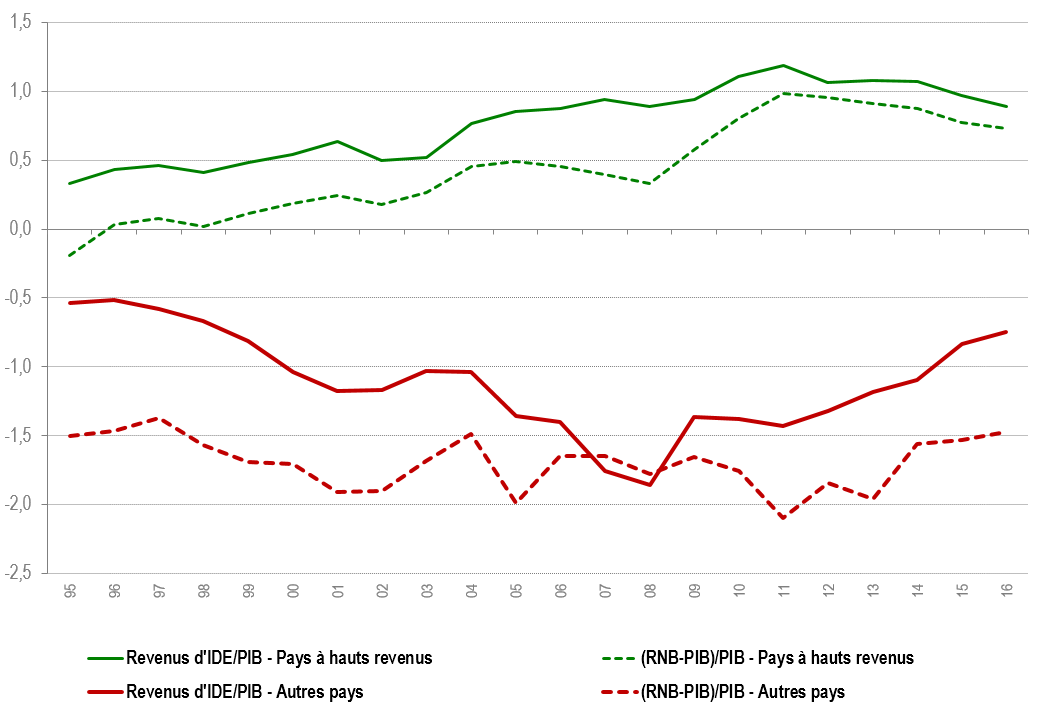 Les flux permettent de caractériser les échanges de revenus mais ne disent rien sur l’importance des déficits ou des excédents des pays. Classés par groupe en adoptant les critères de la Banque mondiale selon le revenu national brut par habitant en 2015, il ressort que le groupe de pays à hauts revenus (à l’exclusion des paradis fiscaux et des pays de l’OPEP) est très largement excédentaire. Cet excédent augmente au cours du temps, passant de moins de 100 milliards de dollars à environ 400 milliards de dollars entre 1995 et 2016. Parmi les pays présentant les soldes de revenus d’IDE les plus excédentaires, on retrouve aussi bien des pays enregistrant des excédents courants (Allemagne, Japon, Suède, Danemark, Pays-Bas, Norvège, Suisse, Islande) que d’autres structurellement déficitaires (États-Unis, Royaume-Uni et France principalement).