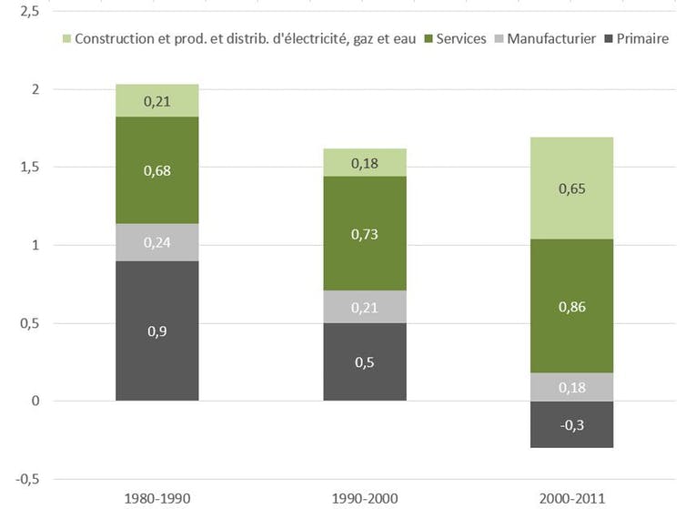 La structure de la population active montre une diminution de l’emploi dans l’agriculture au profit principalement du secteur des services, où la productivité est en moyenne nettement plus élevée que dans l’industrie manufacturière, même si l’écart diminue dans les années 2000 du fait d’une croissance de la productivité plus vive dans l’industrie manufacturière.