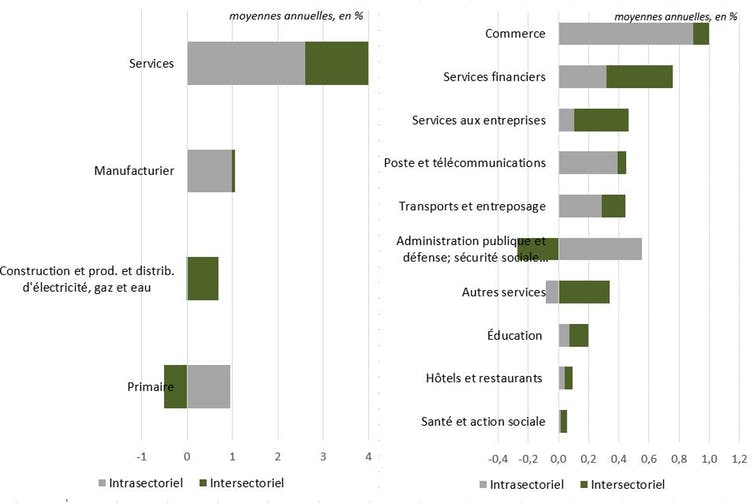 La première composante, intrasectorielle, correspond à la variation de la productivité à l’intérieur même de ce secteur, pondérée par la part de l’emploi dans ce secteur à la période initiale ; la seconde, intrasectorielle, à la variation de la part de ce secteur dans l’emploi pondérée par la productivité de ce secteur à la période finale.