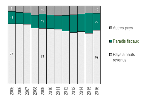 Nous retenons ici la liste de paradis fiscaux proposée par Hines et Rice (1994)[1], liste où figurent notamment des pays comme l’Irlande, le Luxembourg, la Suisse, Chypre, Hong Kong, Macao et une myriade de petites îles du Pacifique et de l’Atlantique. Cet ensemble de pays représente 2,6 % du PIB mondial en 2016. Il apparaît pourtant central dans la localisation des revenus des multinationales : 22 % des flux de revenus d’IDE dans le monde sont ainsi en provenance ou à destination d’un paradis fiscal en 2016 (graphique 1)[2]. Plus d’un cinquième des flux mondiaux de revenus des multinationales passe par un paradis fiscal, soit près de 10 fois plus que ce que leur taille économique impliquerait.
