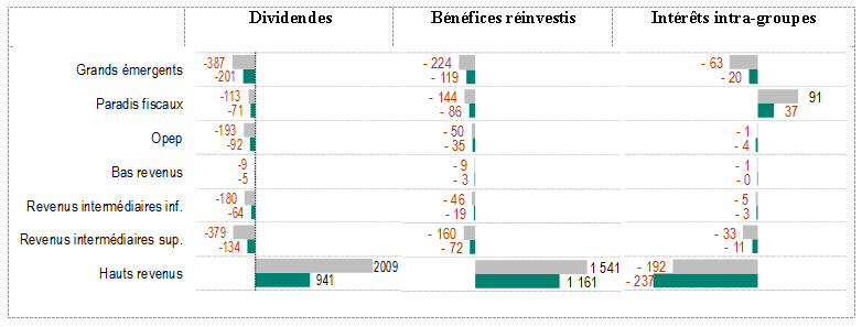 Les profits des multinationales réalisés à l’étranger enregistrés dans la balance des paiements sous le poste des revenus d’IDE revêtent plusieurs formes. Ils peuvent être distribués, réinvestis ou remboursés au titre des prêts que les maisons-mères consentent à leurs filiales (ou l’inverse). Au sein des revenus d’IDE, les intérêts intra-groupe apparaissent clairement une spécialité des paradis fiscaux comme le montre le graphique 2 qui représente les soldes (crédits moins débits) de revenus d’IDE par sous-catégorie. Ils sont ainsi le seul groupe de pays à présenter un surplus du poste des intérêts intra-groupe, les deux autres postes des revenus d’IDE – dividendes et bénéfices réinvestis – étant déficitaires.