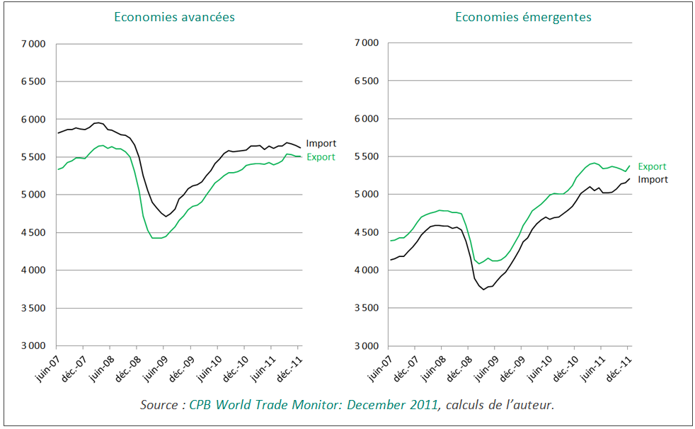 En moyenne, au second semestre 2011, le volume des exportations des économies avancées a retrouvé son niveau moyen du deuxième semestre 2007 ; celui des importations ne l’a pas encore atteint, il reste 4 % en dessous.