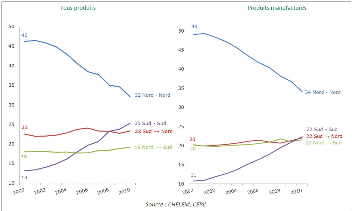 • une forte progression des flux Sud-Sud dont la part double entre 2000 et 2010. En 2010, 22 % des échanges de produits manufacturés et 25 % des échanges tous produits s’effectuaient entre pays du Sud contre, respectivement, 11 % et 13 % dix ans plus tôt.