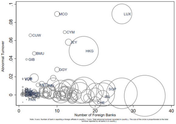 In a recent study (Bouvatier et al. 2018), we dissect hand-collected data of the 37 global and local systemically important banks in the EU. Descriptive statistics reveal that their foreign affiliates are located in a total of 138 countries, including about 30 tax haven jurisdictions (depending on the list we consider). Tax havens represent 1% of the total sample’s population and 2% of GDP, while EU banks record 18% of their foreign turnover and 29% of their foreign profit in these countries.1