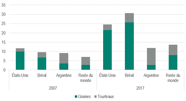 La structure particulière du marché du soja va surement conditionner les impacts des mesures protectionnistes prises par la Chine. D’une part, le soja est échangé sous forme de graines, de tourteaux et d’huile. Les tourteaux et l’huile sont des produits complémentaires, issus de la trituration des graines. Les tourteaux sont largement utilisés dans l’alimentation animale ; L’huile, quant à elle, peut être utilisée en alimentation humaine mais également pour la production de biodiesel. D’autre part, le marché du soja est particulièrement concentré. Après avoir longtemps été le premier pays exportateur de soja au niveau mondial, les États-Unis (30 % des exportations en 2017) ont cédé la place depuis 2013 au Brésil (38 % du soja exporté, voir graphique 1). Avec l’Argentine, qui exporte essentiellement des tourteaux, ces trois pays représentent à eux seuls 85% des exportations mondiales de soja.