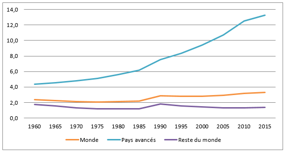 Note : les pays avancés regroupent les pays de l’OCDE hors Chili, Mexique, Turquie, Lettonie, Pologne, Slovaquie, Corée du Sud et Hongrie. En 2015, ce groupe de pays représente 13% de la population mondiale. Un migrant est défini comme une personne qui réside dans un pays où il n’est pas né.