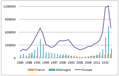 Depuis ses débuts, la conférence a abordé un grand nombre de thèmes : des effets de l’immigration sur les salaires et les finances publiques des pays d’accueil, aux liens qu’entretiennent l’immigration et le commerce international, en passant par des questions relatives à l’intégration économique des immigrés et leurs enfants. La hausse spectaculaire du nombre de réfugiés dans les pays de l’OCDE, dont l’Europe avec plus d’un million de demandes d’asile effectuées en 2015 (Figure 2), a marqué un tournant dans les thèmes de recherche étudiés par les économistes. Ce nouvel élan s’est naturellement traduit par un accroissement du nombre de présentations portant sur les mouvements de réfugiés. Le sujet de la présentation liminaire de George Borjas lors de la session de 2016 en est un parfait exemple. Celle-ci retraçait les résultats d’une étude qu’il menait sur les conséquences de l’afflux massif des réfugiés cubains en 1980 dans la ville de Miami sur les salaires des travailleurs locaux. Plus généralement, depuis l’édition de 2016, les présentations portent davantage sur les effets des réfugiés dans les économies d’accueil et sur les conditions de leur intégration.