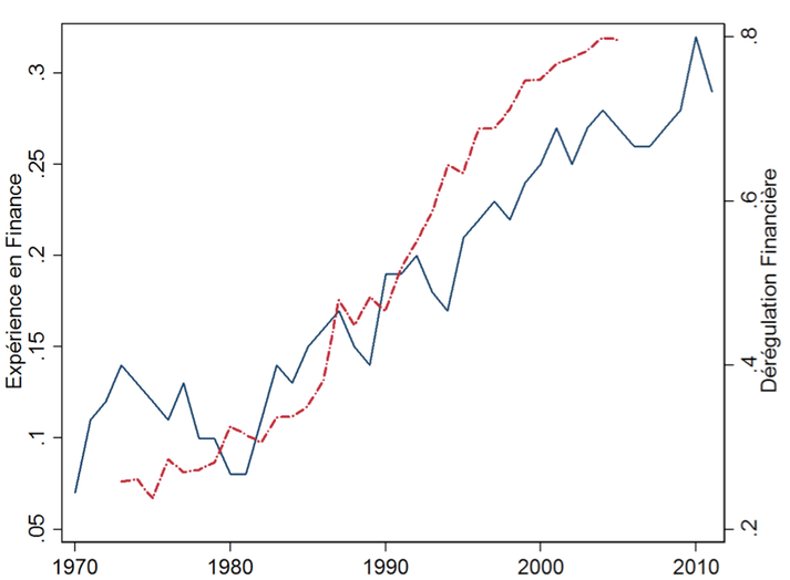 Note : l’ordonnée de gauche représente la part de gouverneurs de banque centrale ayant une expérience dans la finance (ligne bleue continue). L’ordonnée de droite représente l’indice moyen de dérégulation financière (ligne rouge pointillée). Mishra et Reshef (2018).