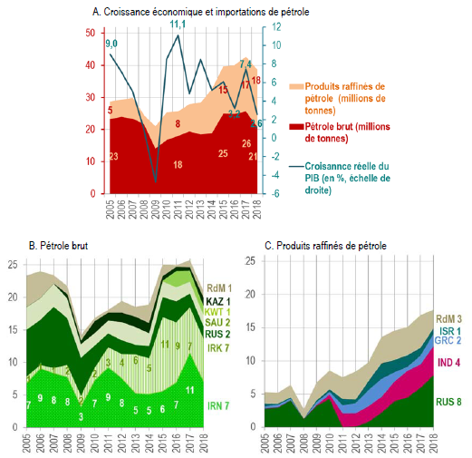 Il faut y voir aussi un effet du tassement de la croissance du PIB de la Turquie (2,8 % en moyenne sur l’année 2018 contre 7,6 % en 2017), dont l’économie est entrée en récession depuis le dernier trimestre 2018. Un tassement qui s’est traduit par une baisse des importations turques de produits pétroliers : 42,7 millions en 2017 contre 38,7 millions de tonnes en 2018 (graphique 1.A).