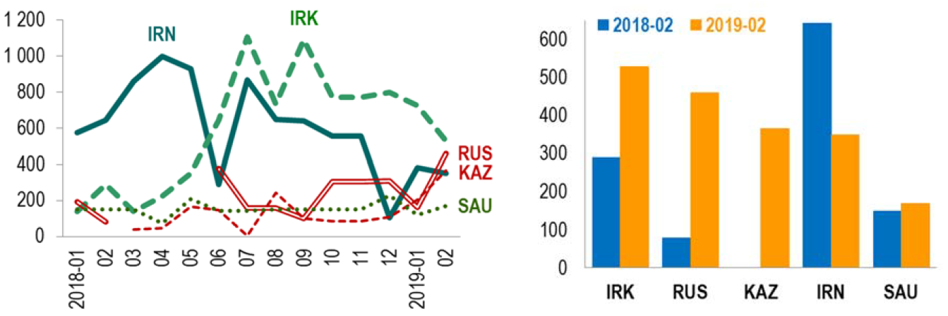 Huit pays, dont la Chine, l’Inde, la Corée du Sud, la Turquie et le Japon, soit les cinq premiers marchés du pétrole iranien (Stanley & Ladislaw, 2018), ont bénéficié d’exemptions jusqu’au 2 mai 2019, date à partir de laquelle les sanctions américaines doivent aussi peser sur ces pays. Comme en 2011, la Turquie s’est prononcée contre ces sanctions de 2018 (Jones, 2019). Pourtant, ses importations de brut iranien ont sensiblement diminué depuis mai 2018 (graphique 2). Certains analystes y voient une acceptation de fait de la décision américaine par Ankara (voir par exemple Ta?tekin, 2019).