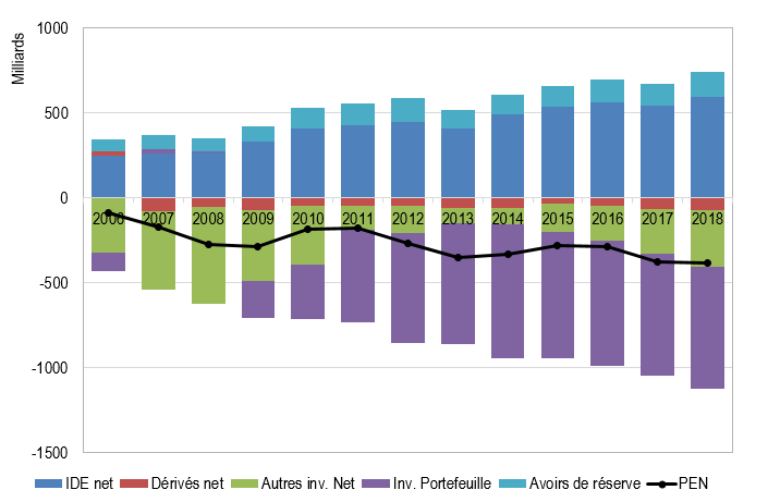 [1] La position extérieure nette mesure le stock net d’investissement des résidents français vis-à-vis du reste du monde. Son niveau ressort à -385 Mds d’euros en 2018, soit 16,4 % du PIB, très proche du niveau de 2017 (- 381 Mds, 16,6 % du PIB) et du même ordre que celui de 2013 (- 350 Mds, 16,5 % du PIB).