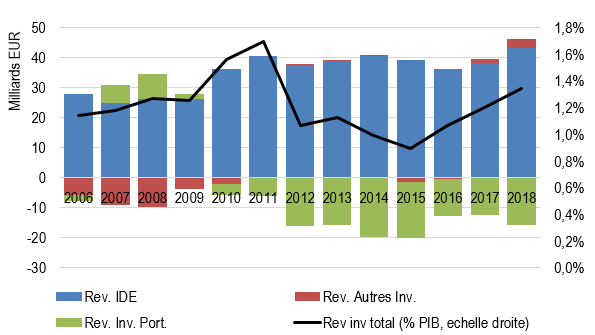 La France est aujourd’hui dans cette situation, et l’année 2018 vient encore l’accentuer. Les revenus d’investissement enregistrés dans le compte courant montrent ainsi que malgré son endettement net vis-à-vis du reste du monde (- 385 Mds d’euros), la France bénéficie de flux de revenus d’investissements positifs, de 1,3 % du PIB en 2018 (graphique 2). Le solde des revenus d’IDE de 43 Mds compense ainsi largement le solde négatif sur les revenus des investissements de portefeuille (- 16 Mds), les revenus des autres investissements affichant un solde positif mais marginal (+ 3 Mds).