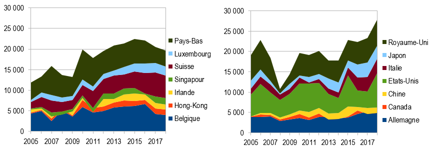 Autre élément intéressant à noter quant aux revenus d’investissement : l’évolution de la géographie des revenus d’IDE, qui reflètent la localisation des profits des multinationales. Les données de revenus montrent que les profits enregistrés dans certains paradis fiscaux et pays de conduit baissent depuis 2016, alors qu’ils augmentent dans les pays du G7+Chine (graphique 3). Cette baisse est tirée par pays de l’UE - Belgique (- 57 % sur 2017/2018 par rapport à 20115/2016), Pays-Bas (- 48 %) et Irlande (- 23 %) -, alors que Singapour ou Hong-Kong enregistrent des hausses. Est-ce là le reflet des politiques anti évitement fiscal mises en place en Europe dans le cadre du plan BEPS (pour Base Erosion and Profit Shifting) ? À suivre…