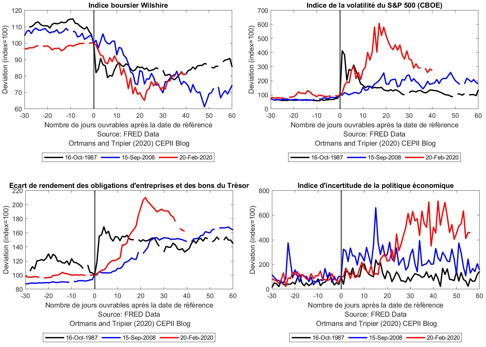 - Dans un premier temps, l'indice des valeurs boursières a chuté de plus de 30 %, une baisse plus importante qu'en 1987 et 2008, avant de rejoindre la trajectoire observée lors de la crise financière de 2008.