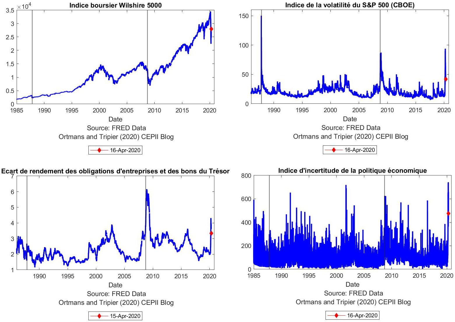 La pandémie du Covid-19 continue de se propager dans le monde dans un contexte de forte incertitude sur l'efficacité des politiques de santé[1]. Les décideurs politiques cherchent à prévenir une explosion de l'incertitude financière et économique pour réduire les coûts économiques de la crise du Covid-19[2]. L'objectif de ce blog est double. Tout d'abord, présenter un tableau de bord pour suivre l'incertitude dans l'économie américaine. Des indicateurs quotidiens de valorisation boursière, de volatilité des marchés boursiers, d’écart de rendements entre obligations d’entreprises et de l’État et de l'incertitude sur la politique économique sont proposés pour obtenir une vue synthétique de la situation américaine. Ensuite, comparer l’évolution de l’incertitude dans la crise actuelle à celles des crises financières de 1987 et 2008 en examinant l'évolution de ces indicateurs aux cours de ces différentes crises.