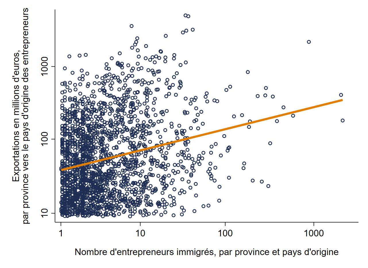 Pour autant, les entrepreneurs immigrés ont-ils un effet significatif sur les performances exportatrices des provinces dans lesquelles ils sont présents ? Au cours de la période 2000-2011, les provinces italiennes où les entrepreneurs nés à l’étranger étaient plus nombreux sont aussi celles où les exportations ont été plus élevées vers le pays d’origine de ces entrepreneurs. C’est ce qu’illustre le graphique ci-dessous et c’est aussi ce que confirme l’analyse économétrique.
