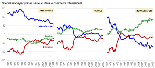 L’utilité pratique de ces pages interactives, qui recèlent de nombreux graphiques et tableaux, peut être illustrée par quelques exemples. Ainsi, les avantages comparatifs par grands secteurs marquent le fort engagement de l’Allemagne dans le manufacturier, et du Royaume-Uni dans les services, alors que les forces et faiblesses de la France sont moins prononcées (graphique 1).