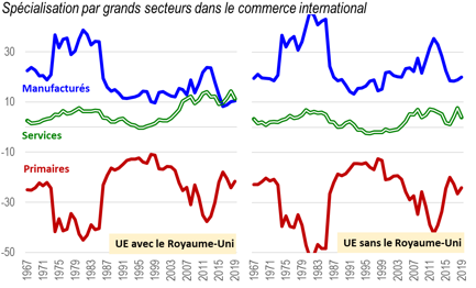 Elles permettent par exemple d’illustrer les conséquences commerciales du Brexit, un cas inédit de désintégration régionale dans une économie globale qui, depuis la Grande Récession de 2008, connaît un retour significatif de la protection. En l’occurrence, ces données montrent que, à la suite du Brexit, l’avantage comparatif dans le tertiaire se trouve annulé à l’échelle de l’Union, si bien que le manufacturier concentre désormais ses points forts (graphique 2).