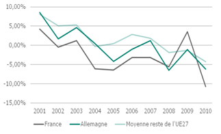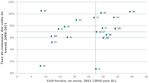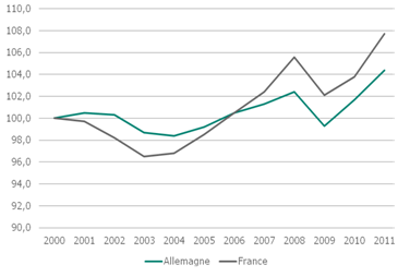 Les coûts du travail français sont souvent pointés du doigt, et pour cause : en 2011, le coût du travail horaire en France avoisine les 35 euros contre 30 euros en Allemagne. De plus, entre 2008 et 2011 les coûts français ont, en moyenne, connus une croissance plus soutenue que les coûts allemands (8% contre 6%, cf. Graphique 2). Mais cet écart suffit-il à expliquer les mauvaises performances françaises ?
