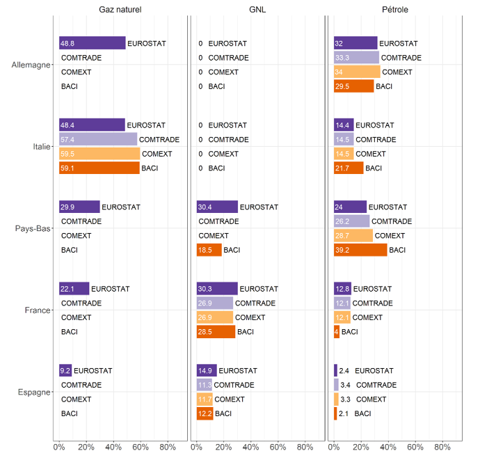 Note : Les chiffres dans les barres indiquent la part de chaque pays dans les importations de gaz sous forme gazeuse (code SH6: 271121), de gaz naturel liquéfié (code SH6: 271111) et de pétrole brut (code SH6 : 270900) de l’UE, selon la source utilisée.