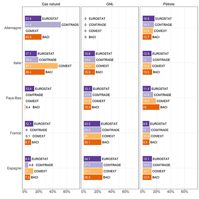 Pour quatre de ces cinq pays, ni Comtrade, ni Comext, ni BACI ne mentionnent d’importations de gaz naturel russe en 2019, alors que la part de marché de la Russie s’échelonne en réalité entre 9 % pour l’Espagne et 49 % pour l’Allemagne. L’Italie est le seul pays pour lequel les données de commerce font apparaître des importations de gaz naturel russe, mais la part de la Russie y est surestimée d’environ 10 points de pourcentage.