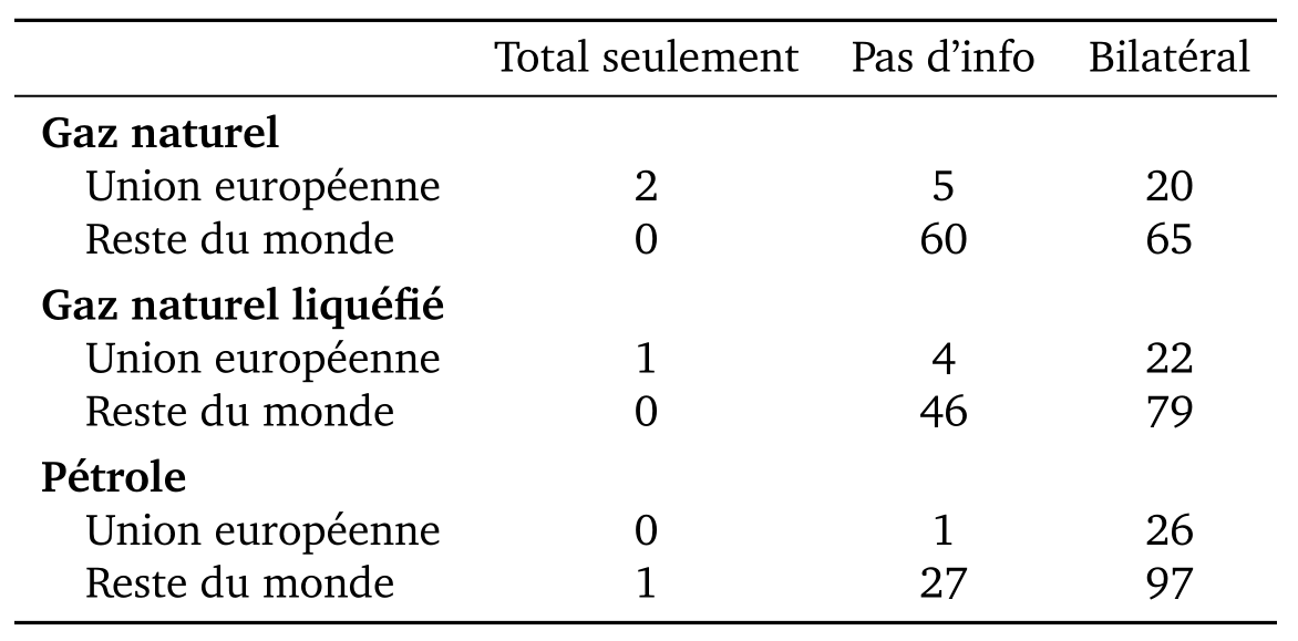 En outre, dans le cas du gaz, même lorsqu’un des deux pays fournit la provenance de ses flux, l’information n’est pas toujours fiable car certains États n’indiquent pas le pays d’origine mais le dernier pays de transit. C’est par exemple le cas de la France qui déclare importer l’ensemble de son gaz de pays limitrophes (Belgique, Allemagne, Espagne et Suisse)… qui ne sont pas producteurs.
