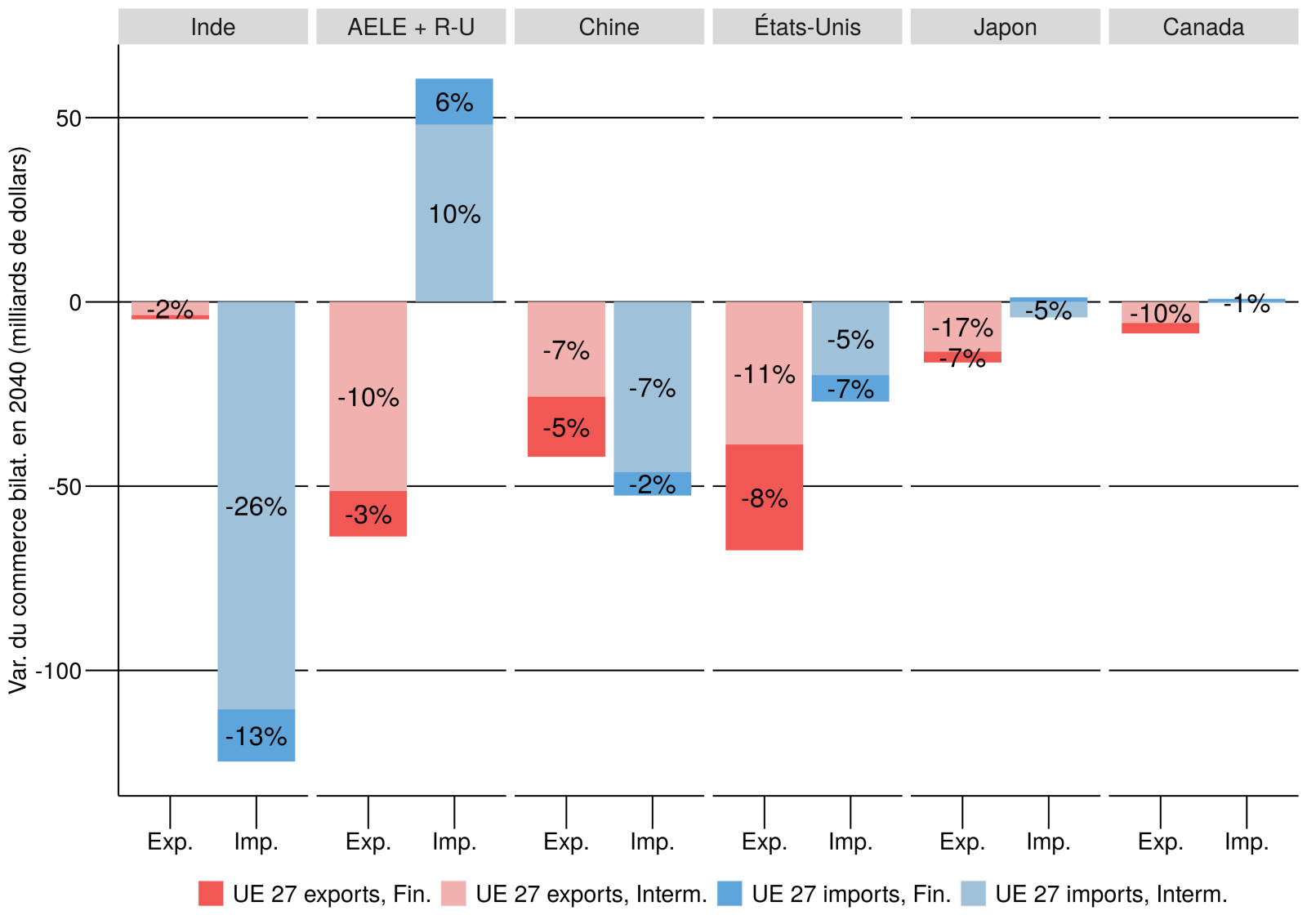 Il est intéressant de noter que le MACF produit une amélioration des soldes commerciaux avec l’UE pour le Canada, le Japon et les États-Unis. Le Royaume-Uni et l’Association européenne de libre-échange constituent un cas extrême : ils bénéficient d’une compensation à la frontière réduite, du fait de la prise en compte de leurs propres politiques climatiques, et augmentent donc leurs exportations, alors même que cet effet se cumule avec une perte de compétitivité des exportateurs de l’UE. La baisse de compétitivité européenne est également importante sur d’autres marchés. À l’autre extrême, le MACF affecte fortement l’Inde, dont les exportations de biens intermédiaires à destination de l’UE baissent de 26 %.