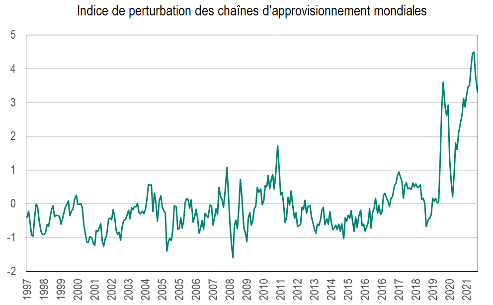 Or, c’est également dans l’automobile que les contraintes de l’appareil productif ont été les plus criantes avec de nombreux goulets d’étranglement. Et en effet, les variations de l’indice du degré de perturbation des chaînes d’approvisionnement mondiales[1] montrent que si les contraintes liées à l’offre se sont un peu relâchées fin 2021, elles demeurent à un niveau historiquement élevé pour l’ensemble de l’économie (graphique 4).