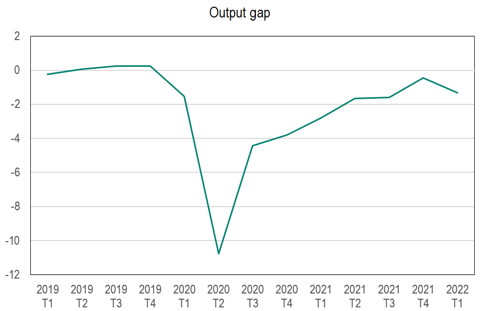 Ensuite l’économie américaine ne paraît pas avoir atteint le plein emploi. L’output gap demeure négatif, ce qui signifie que la production se situe sous son niveau potentiel (graphique 5). Pris isolément, cet indicateur peut être insuffisant car il repose sur des estimations impliquant nombre d’hypothèses théoriques parfois hasardeuses, et son estimation a par le passé déjà été biaisée à la baisse et a conduit la Fed à mener des politiques trop accommodantes. Mais, argument sans doute plus convaincant, le PIB réel a baissé au premier trimestre 2022 (-1,5 %), ce qui rend peu probable le scénario d’une surchauffe de l’économie américaine. Dans une telle situation, il aurait été difficile de soutenir une hausse de taux plus tôt, ou plus forte, l’économie n’étant nullement en surchauffe.