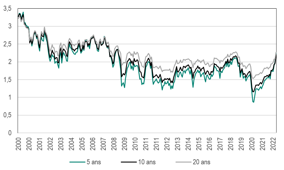 Quoi qu’il en soit, les anticipations d’inflation demeurent de toute façon modérées : bien qu’en hausse depuis 2021, elles restent peu élevées, autour de 2 % à 5, 10 et 20 ans.