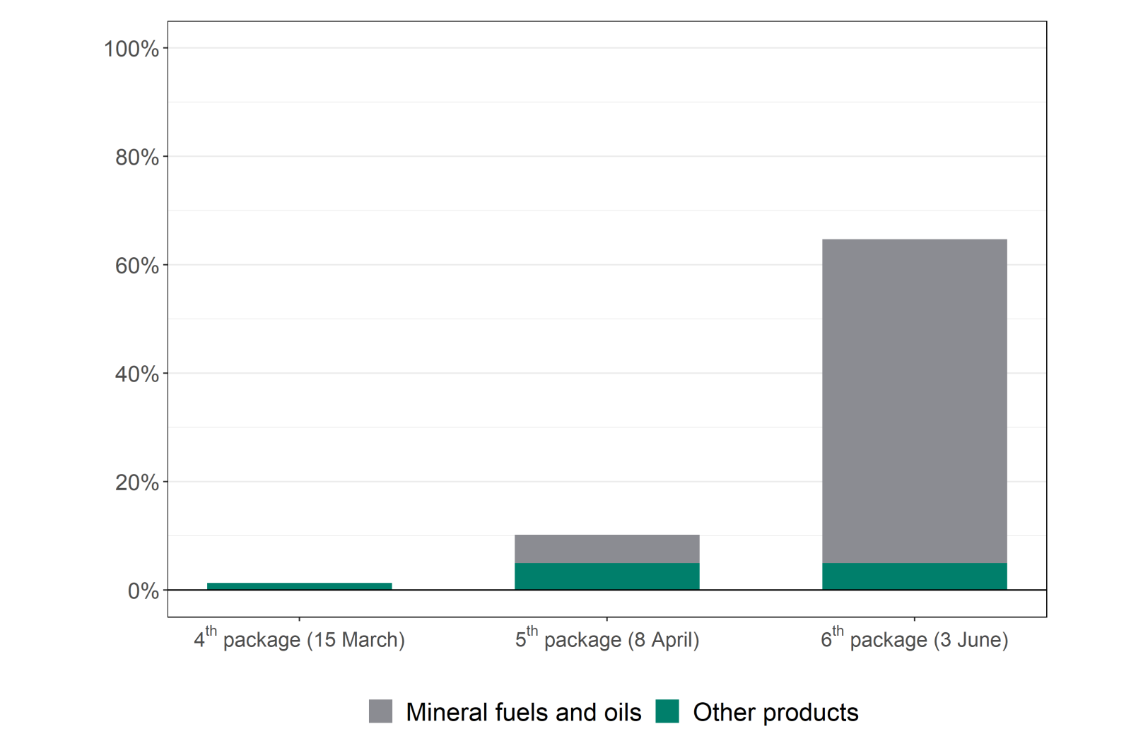 Since the fifth package, trade sanctions on Russian imports have covered 10% of Russian goods crossing the EU border, equivalent to €14-17 billion of trade (these figures are calculated based on 2019 trade data, in a bid to avoid incorporating the effects from the Covid-19 crisis). Once the sixth package has become fully effective at the end of the year, that figure will have risen to 65%.