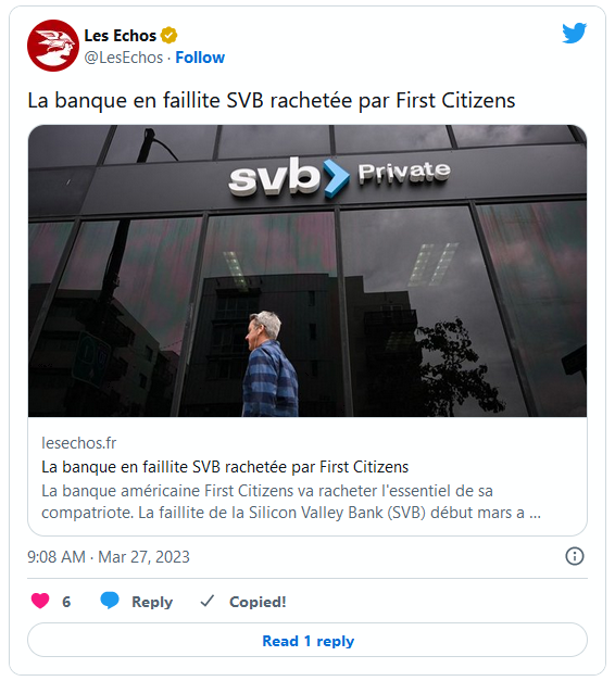 En effet, lorsque le 8 mars, SVB a annoncé une perte de 1,8 milliard de dollars, après une vente d’actifs, révélant la faiblesse de sa stratégie d’investissement, ses déposants non assurés ont paniqué et retiré, le 9 mars, 42 milliards de dollars de leurs comptes. Résultat, ce jour-là la trésorerie de SVB passait en territoire négatif (958 millions) et la faillite était actée. Le fonds de garantie des dépôts américains, le FDIC, a alors annoncé une mesure d’urgence : l’assurance de l’intégralité des dépôts de SVB, y compris ceux dépassant le seuil des 250 000 dollars.