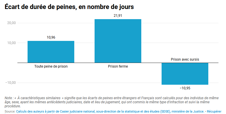 Enfin, les immigrés subissent un traitement différencié? à toutes les étapes du système pénal : de la probabilité? d’arrestation à celle d’être incarcéré. Ainsi, les minorités visibles issues de l’immigration ont une probabilité? plus forte d’être contrôlées, mais aussi de recevoir des peines plus lourdes. En moyenne, pour un même délit avec les mêmes antécédents judiciaires, en ayant suivi la même procédure et avec les mêmes caractéristiques individuelles (âge, sexe, lieu et date de jugement), les étrangers ont non seulement une probabilité plus forte (de 5 points de pourcentage) que les Français d’avoir une peine de prison ferme, mais sa durée est également plus longue, de 22 jours.