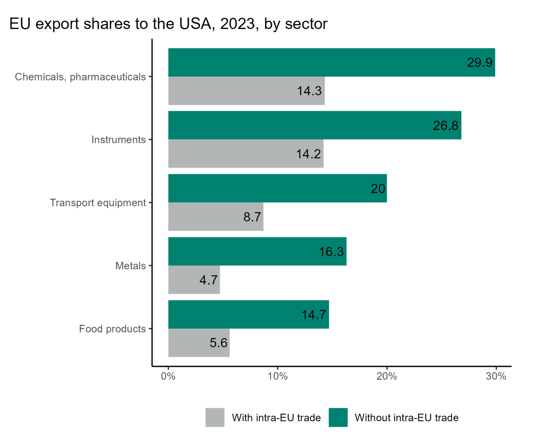 For other sectors targeted by the U.S. trade offensive, exposure remains significant but lower: 20% for transport equipment, 16% for metals, and 15% for food products. Taking the EU Single Market into account, the degree of exposure appears more moderate, but the U.S. still represent a substantial share: including intra-EU trade, 8% of European exports go to the United States.