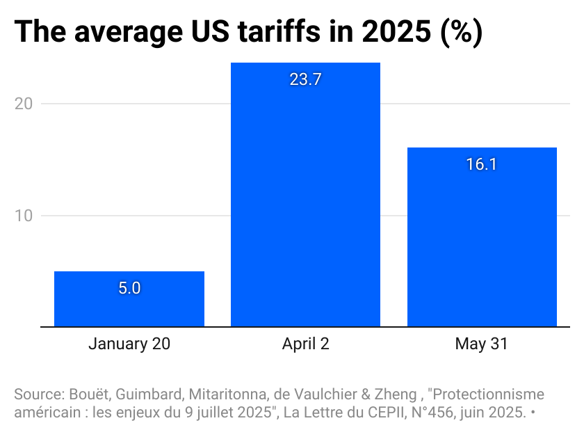 Between January 21, 2025—the day of President Trump's inauguration—and April 2, Liberation Day, average U.S. tariffs imposed on all trading partners rose from 5% to 23.7%, before falling back to 16.1% at the end of May. This represents a 4.7-fold increase in just over two months, followed by a one-third decrease in under six weeks. As of now, the U.S. administration has yet to determine the future direction of its tariff policy.