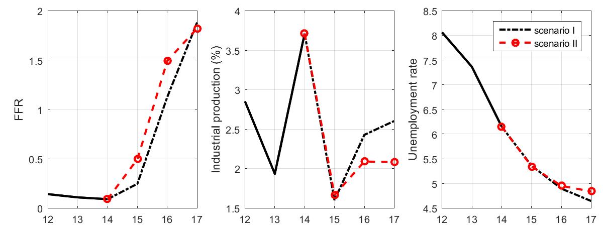 A more gradualist Fed would benefit the economy. To assess the effect of a faster exit from the zero interest rate policy, we simulate a second scenario. In it, the Federal Reserve announces that the federal funds rate will instead be systematically 50 basis points higher than those expected in the benchmark above, following a quarterly path of 0.75%, 1%, 1.25% and 1.5%. As shown in Figure 1, the announcement that monetary policy will be more contractionary than expected leads to a notable slowdown in economic activity. Under this alternative scenario, economic activity slows down (the growth of industrial production slows down by about 0.35% in 2016 and 0.50% in 2017). Likewise, unemployment becomes more sticky.