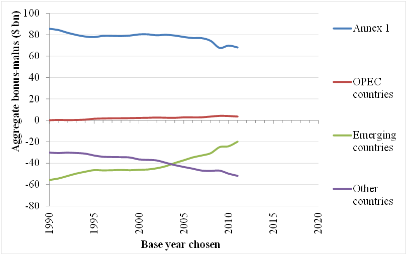 Figure: Effect of the base year for the bonus-malus system (1990-2011) ![]() Source: Climate Economics Chair based on World Resources Institute data (2014).