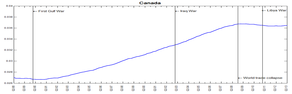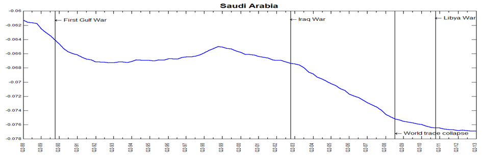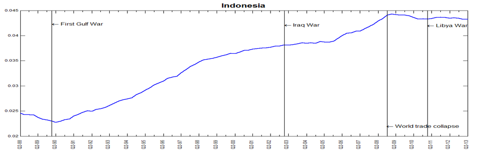 We consider a sample of five oil exporters, namely Canada, Indonesia, Norway, Saudi Arabia, and the United Kingdom, over the 1988Q1-2013Q2 period. We start by investigating whether the response of real exchange rates to unexpected oil price shocks whatever their underlying source, has changed over time. Our interest is to detect possible structural shifts in oil economies and to have a first insight regarding the potential of the time-varying oil-currency property for our selected oil-exporting countries. Figure 1 reports the dynamics of the contemporaneous relationship between the real effective exchange rate and the real oil price.